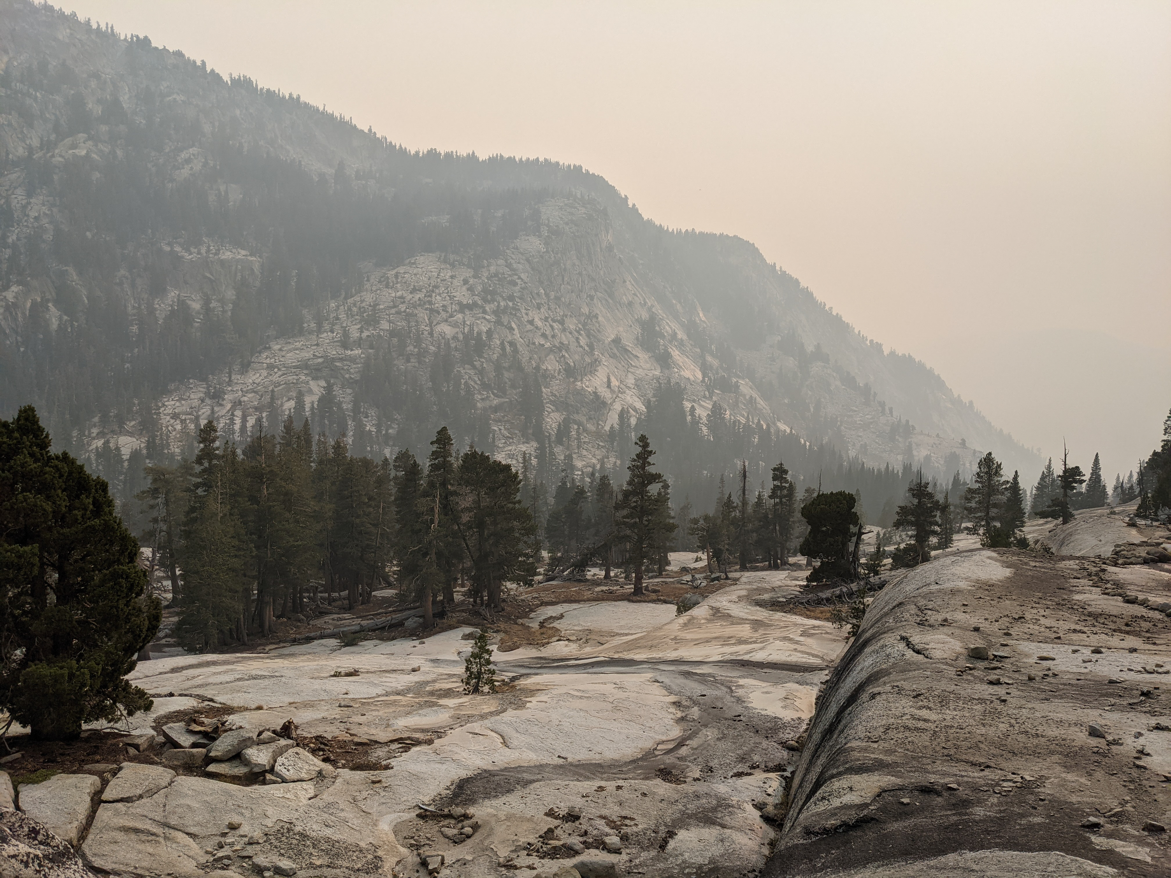 Looking back south from near the crossing of the Lyell Fork. The Isberg Pass Trail traverses a bench high above the Merced and would have some impressive views to the west along much of its length. Unfortunately, we couldn’t see much through the smoke, so we just put our heads down and hiked.