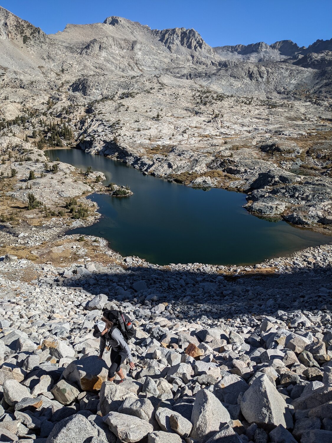 Shannon descending to the Lyell Fork. We discussed a plan, at this point our sole focus was getting back to Tuolumne Meadows as we didn’t expect the smoke to clear at all in the next day or so. It was a bit too far to make it back this evening, so we figured we would just take the most direct route back over Vogelsang Pass and get there tomorrow. We would just have to see how far we got today.