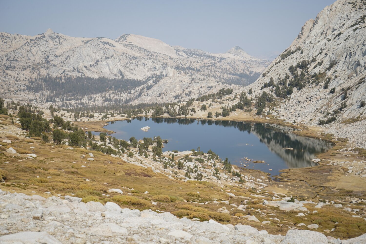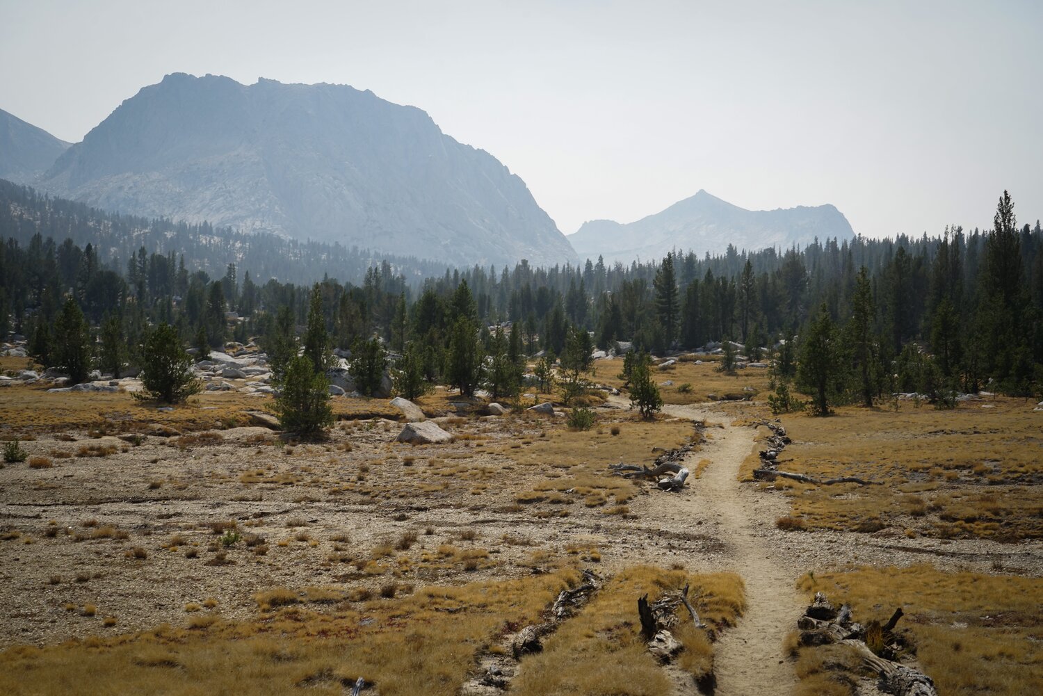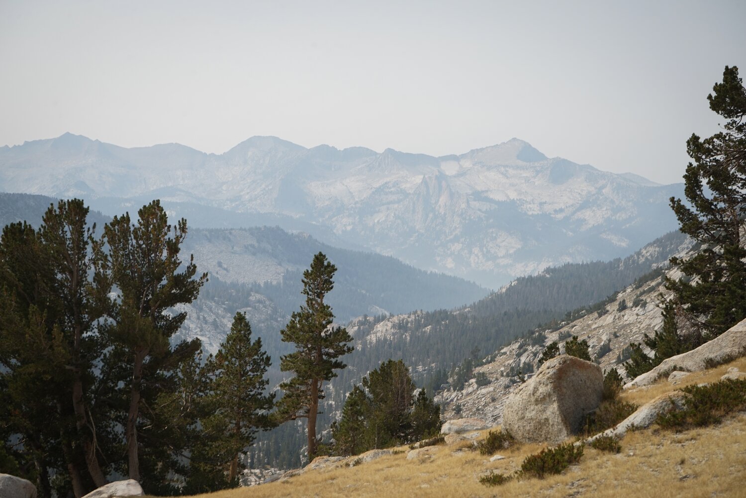As morning turned to afternoon the smoke thickened. We had been wearing N95 masks all day which helped tremendously, but it began to sting our eyes a little bit. After many hours of hiking we reached the turn off to the ranger station. Our car was over at the Cathedral Lake Trailhead though, so we had to hike an additional two or three miles along the John Muir Trail through Tuolumne Meadows to get back. This stretch of trail wasn’t really that great, just a slog through the forest made a bit more uncomfortable by the now heavy smoke. But we were somewhat committed and at about 3:30 we reached our car and sat down for a rest before heading west for home.