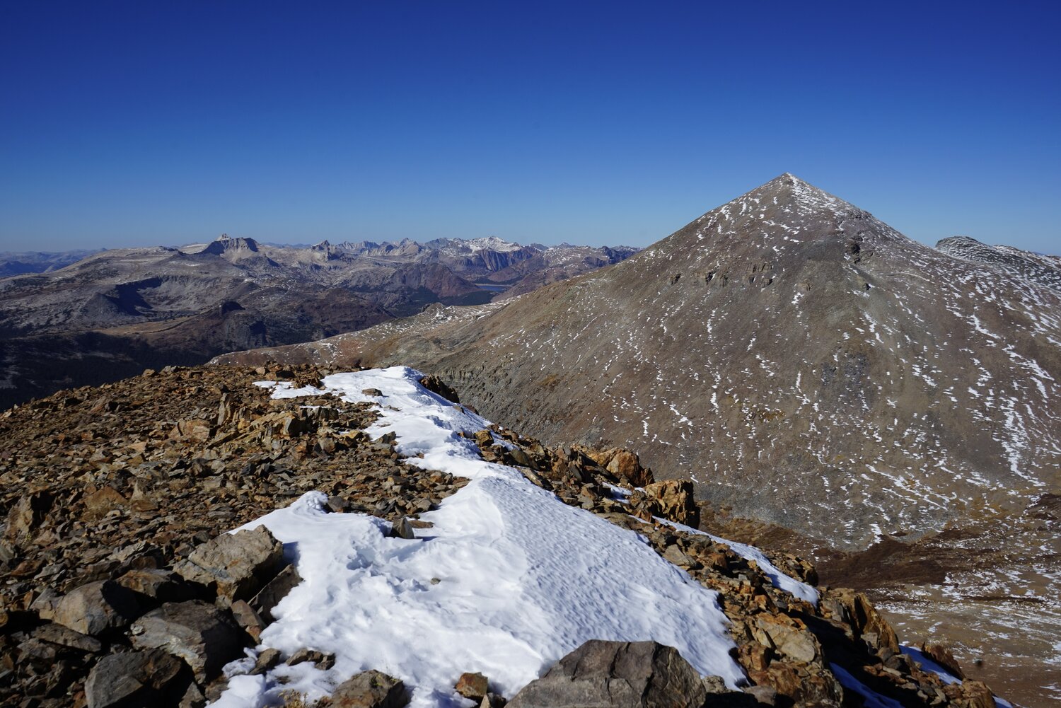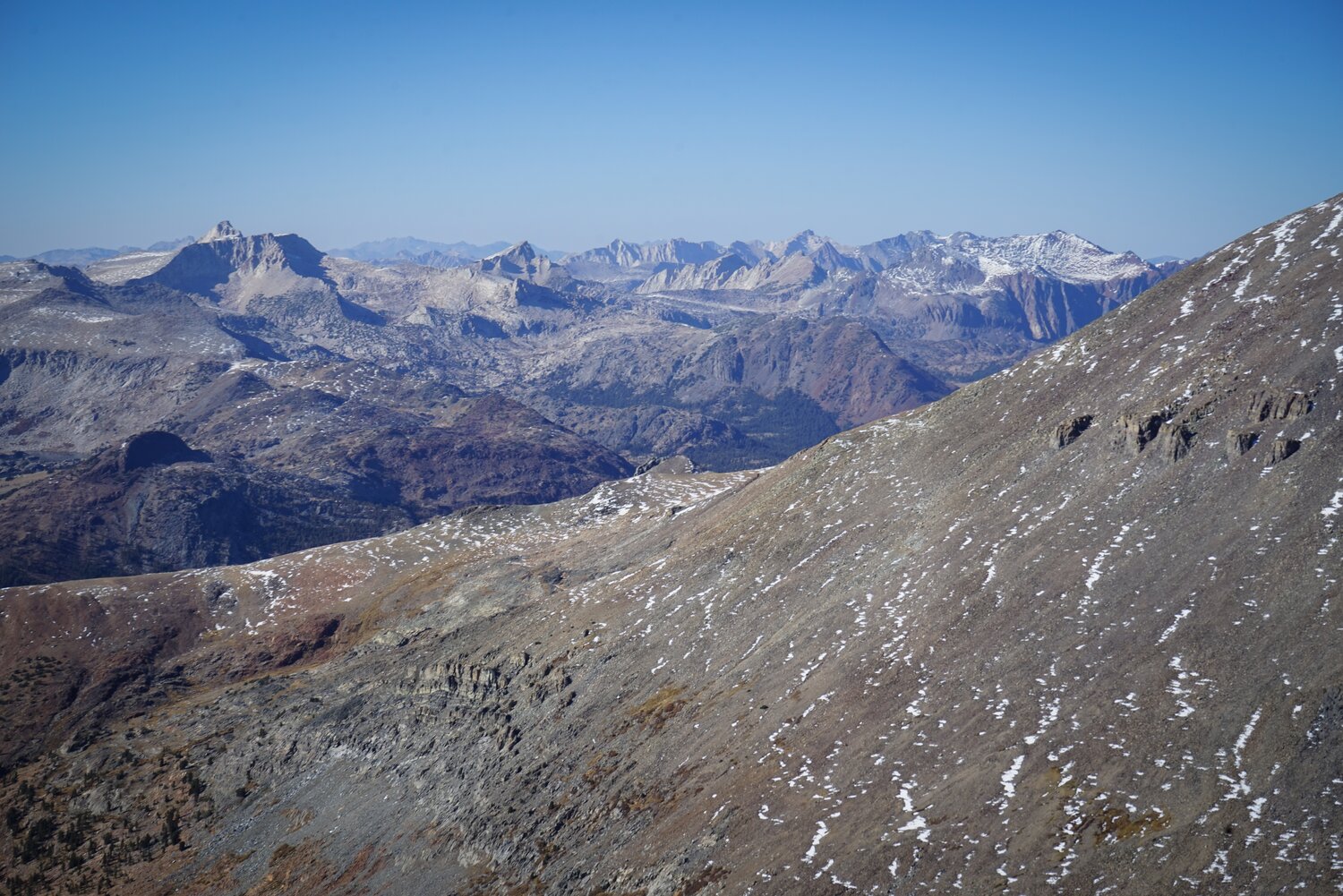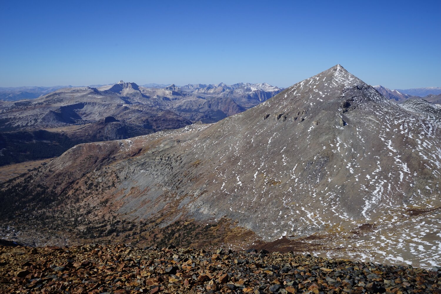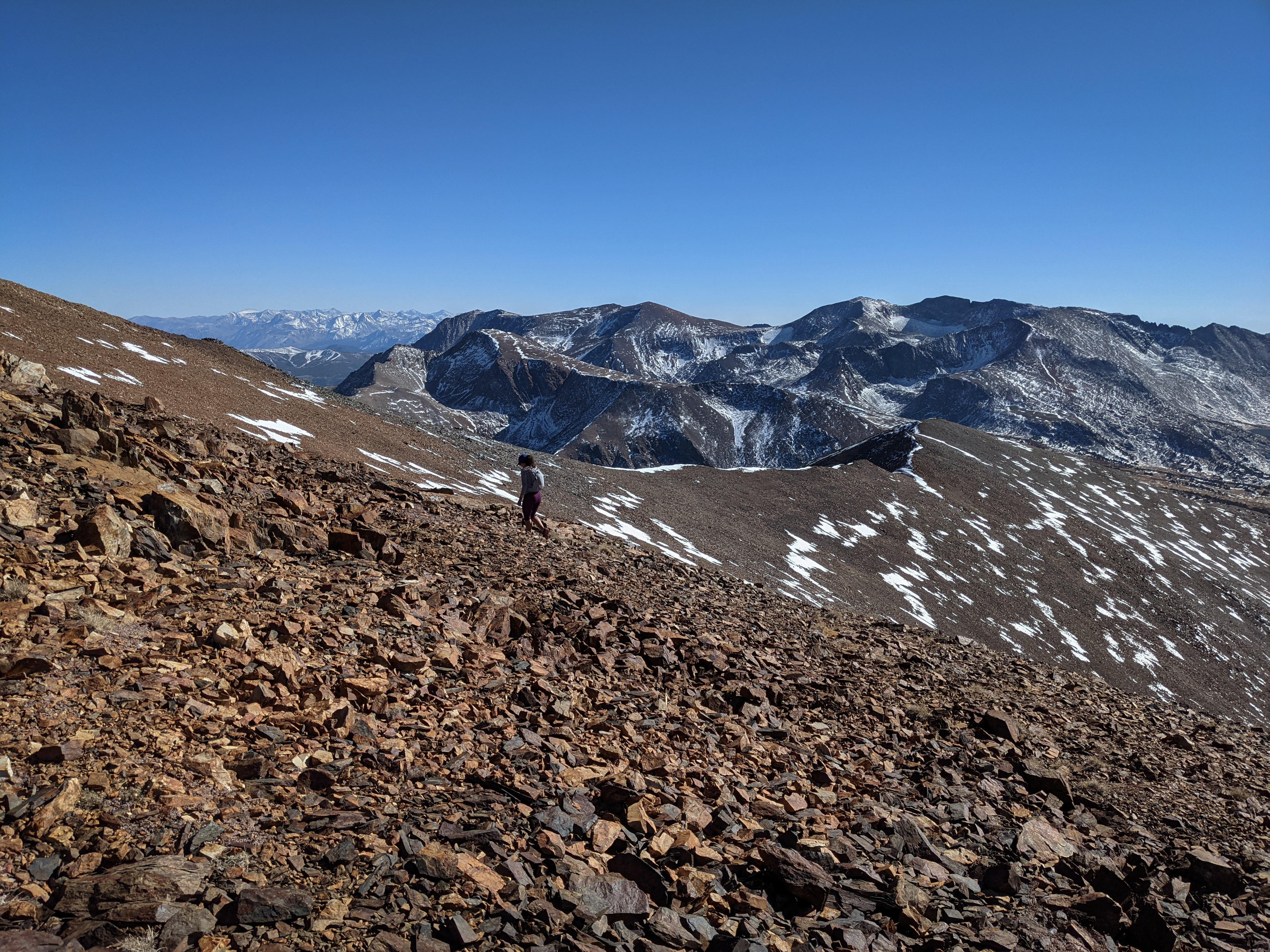 Looking north towards Mount Conness from the flat part of the ridgeline near the summit. We continued down and down over easy terrain. Shannon’s headache from the altitude became worse on the descent, unfortunately.