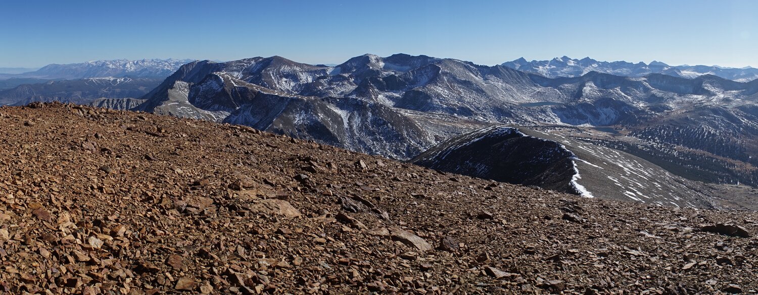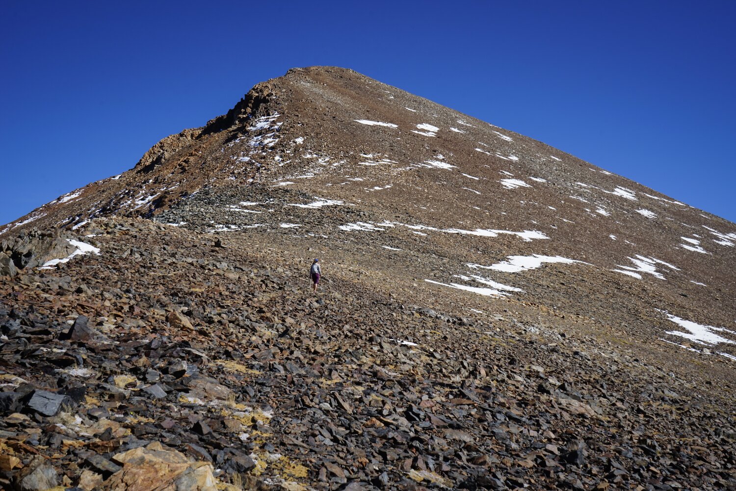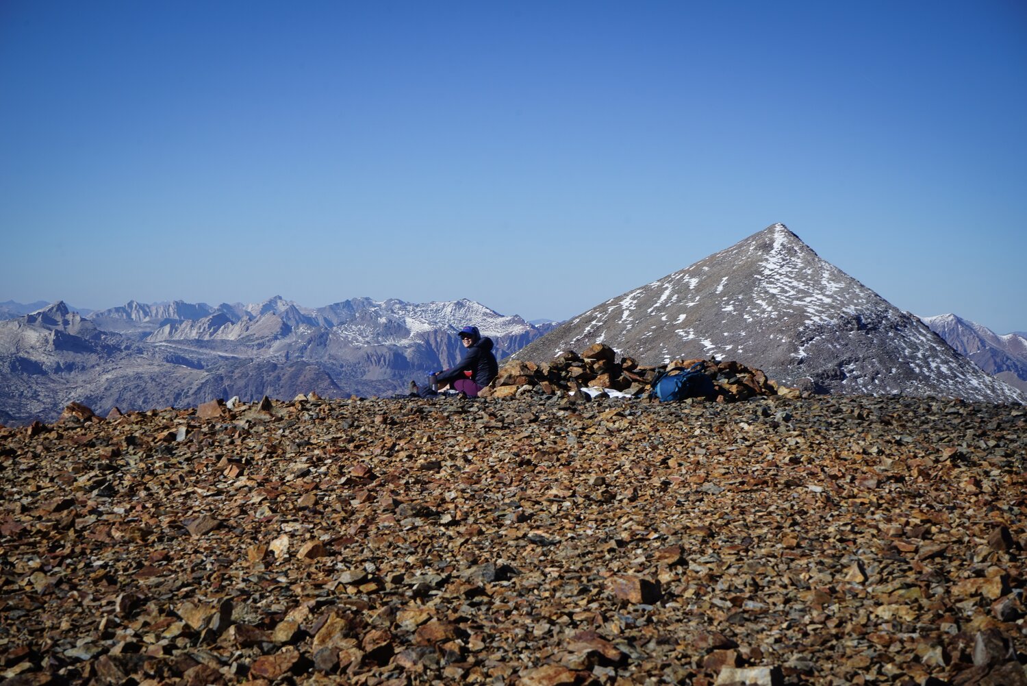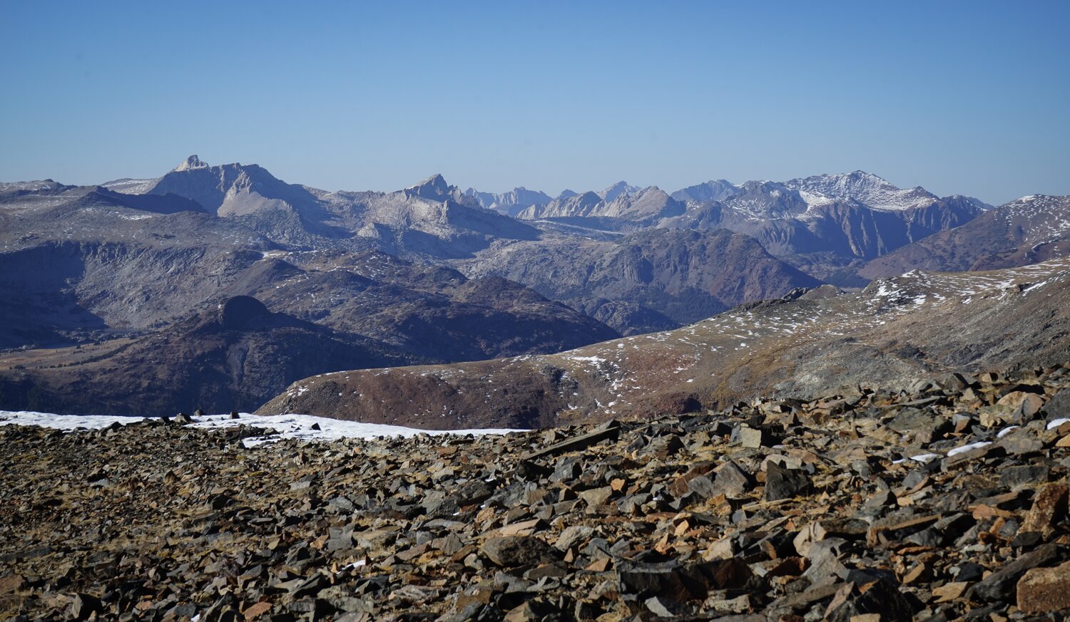 Looking north towards Mount Conness from the flat part of the ridgeline near the summit. We continued down and down over easy terrain. Shannon’s headache from the altitude became worse on the descent, unfortunately.
