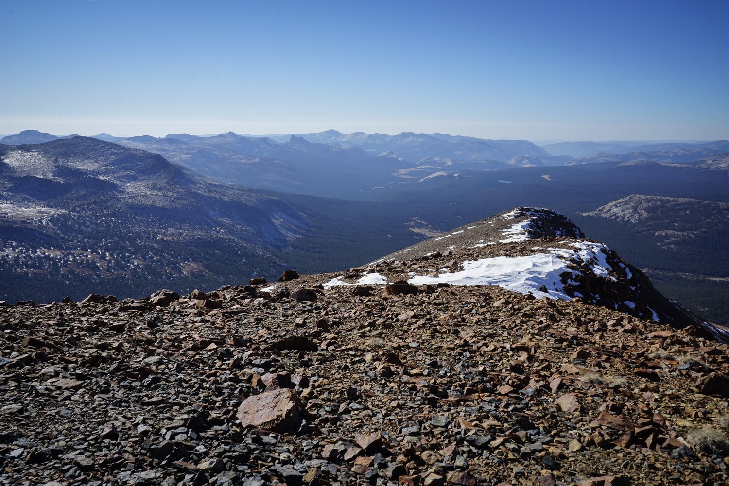 We reached the Mono Pass Trailhead and set out hiking at about noon. We followed the trail for about half a mile before hiking into the forest, searching for the northeast ridge. On our way up we missed it by a bit, hiking just left of the creek that ran down between Mount Dana and Mount Gibbs. After a few hundred feet of climbing we climbed through some snow and up onto the ridge proper. From here, the ridgeline climbed another almost 2,000’ above us.