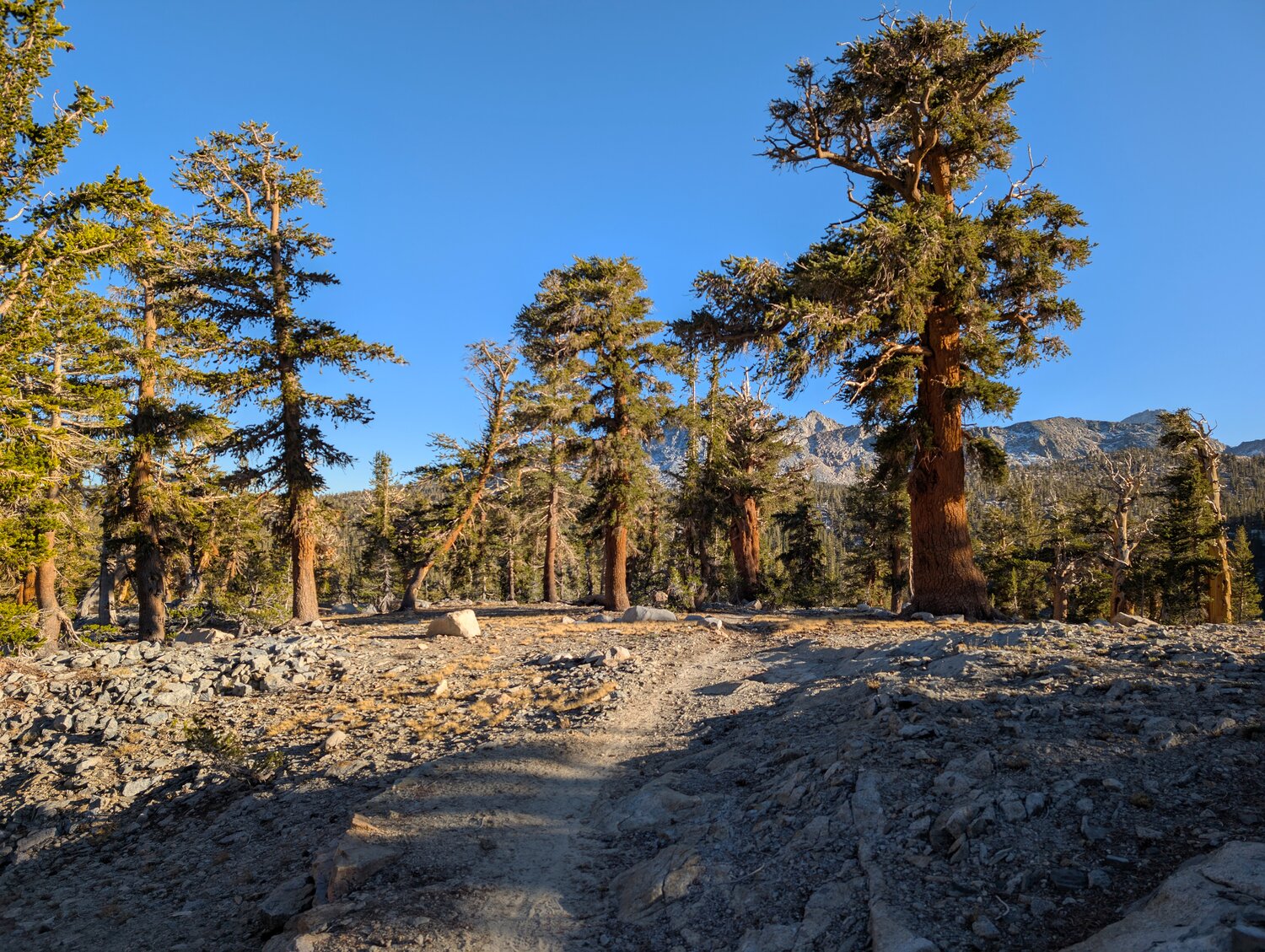 Beautiful Foxtail Pines in afternoon light near Little Five Lakes.
