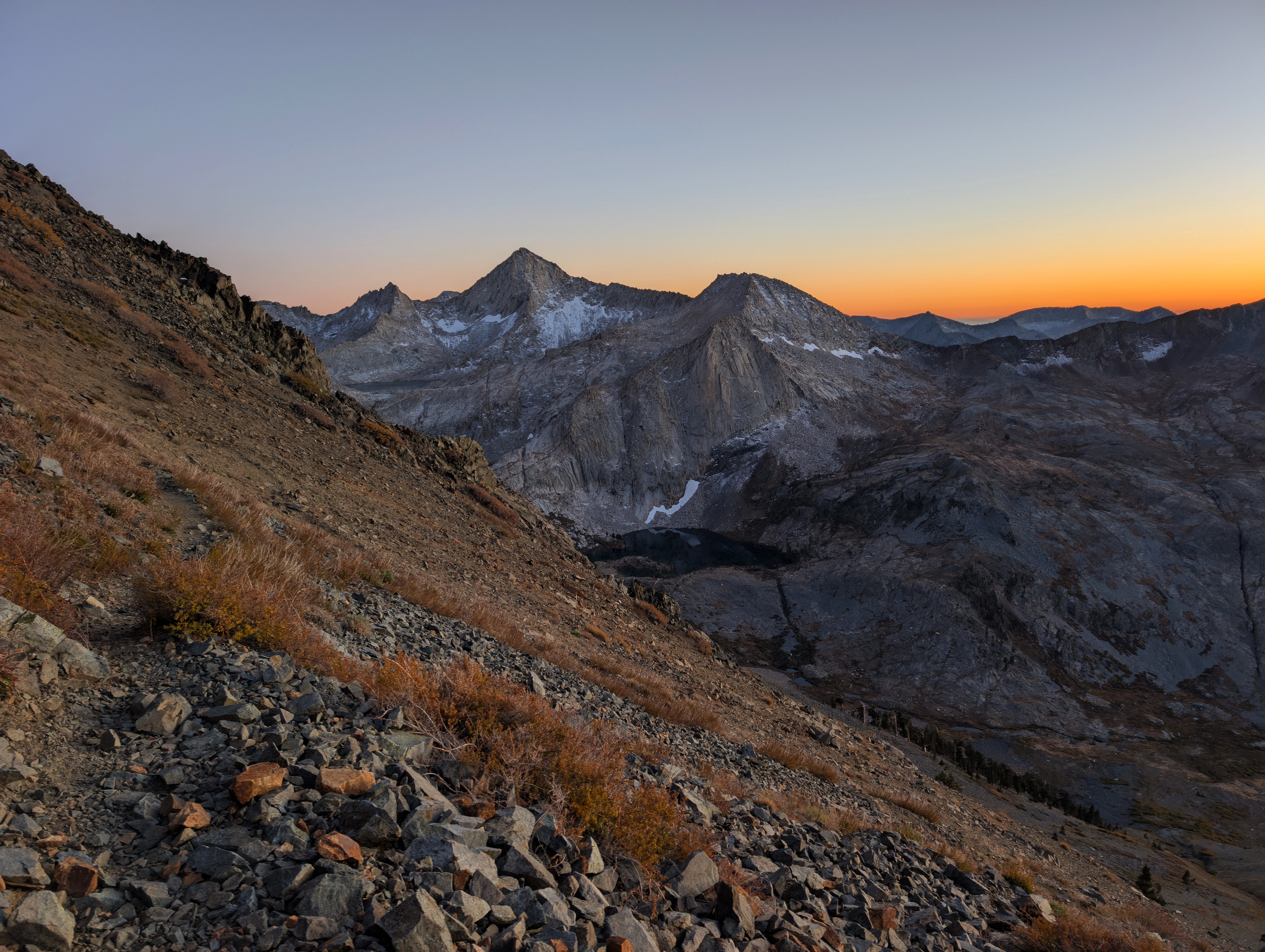 Sunset light behind Sawtooth Peak. We donned our headlamps atop the pass, but didn’t need them until we were a few hundred feet down the pass's west side. The trail over this pass is in very good shape, so it was not a big deal to hike it by headlamp.